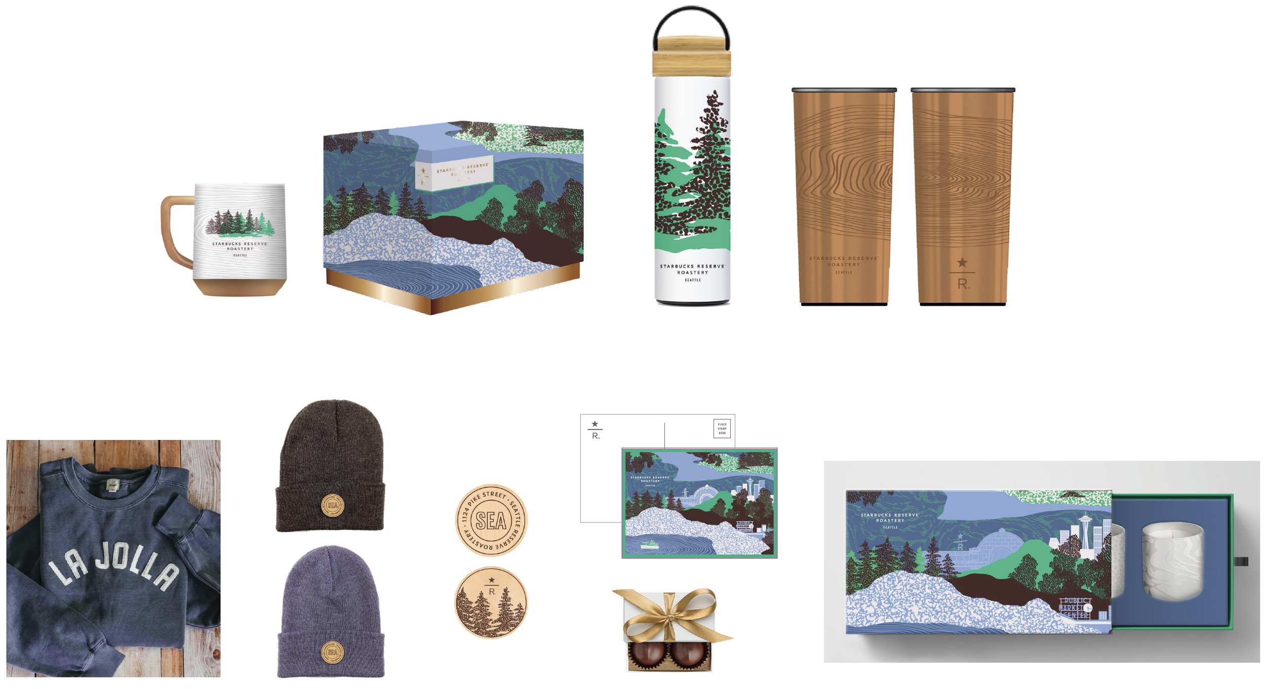 Take Studio-developed color palettes and graphics and develop a new merchandise line specifically focused on the local flavor of Seattle, Chicago, and New York City.