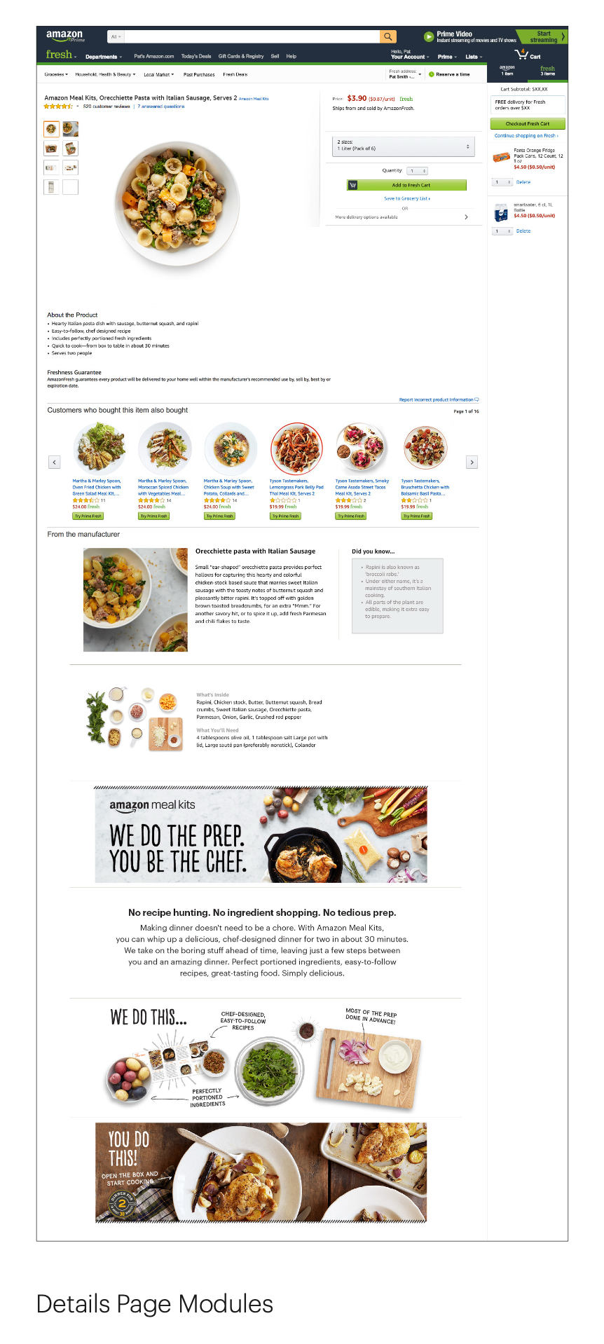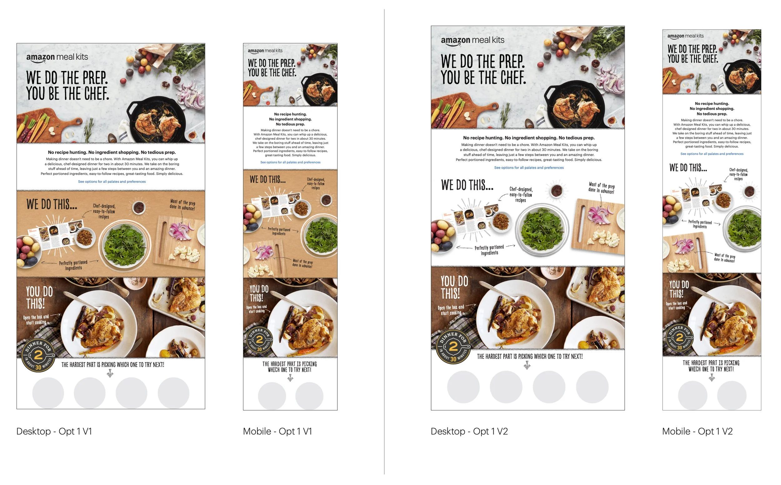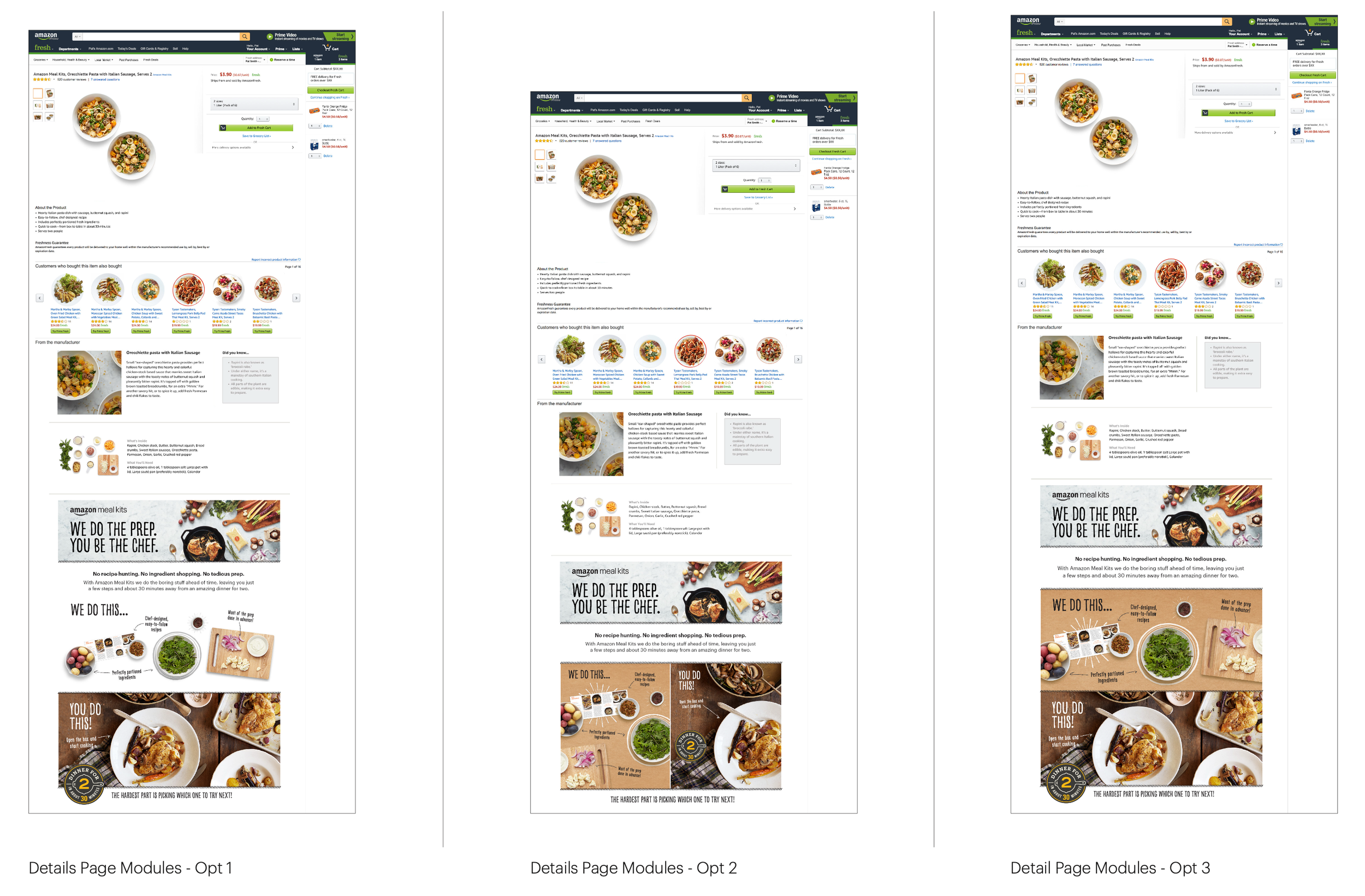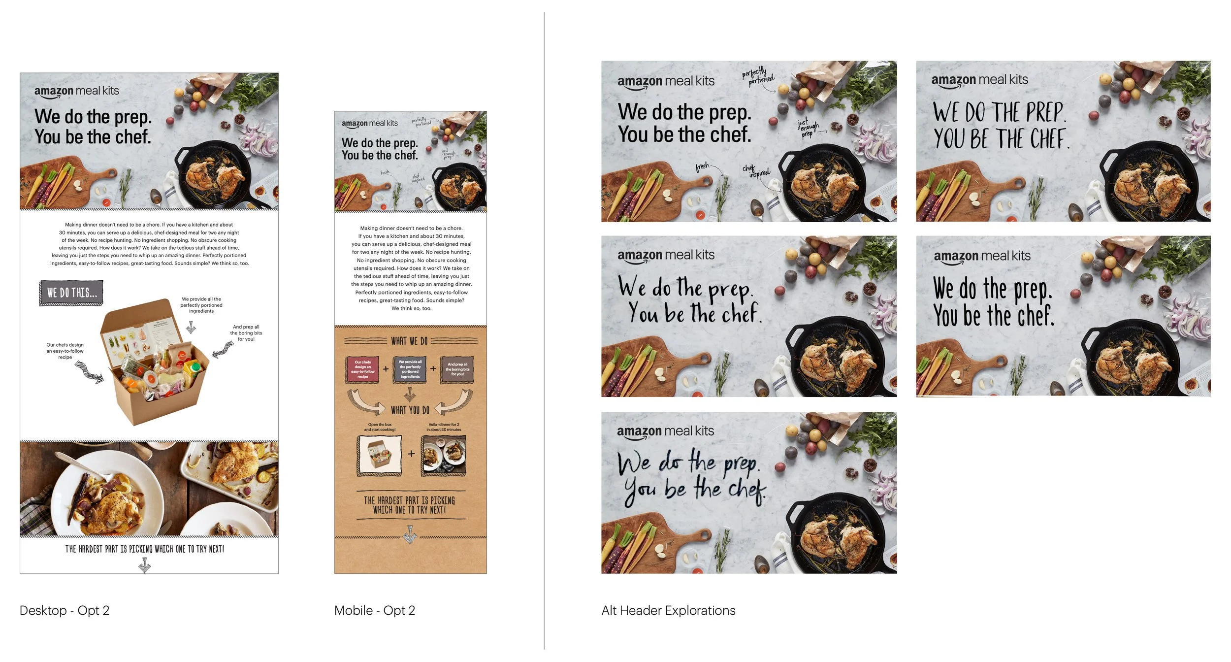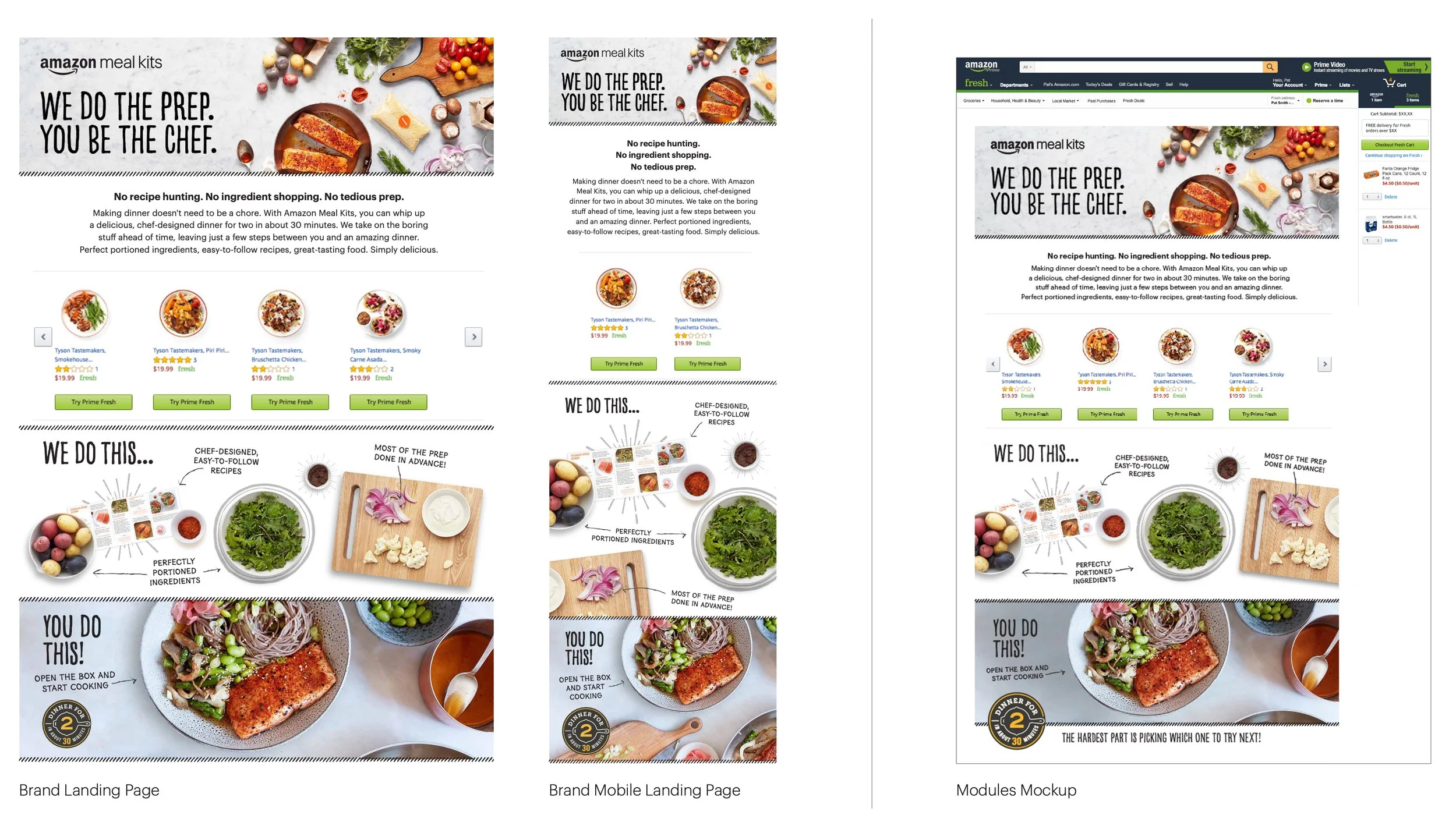 The Amazon Meal Kit brand was launching on Amazon Fresh and, as an Amazon-branded product, was expected to draw significant media and consumer attention. The public launch required putting the brand’s best foot forward by establishing a clear, public-facing identity—one that intentionally distinguished Amazon Meal Kits from Amazon Go and Amazon Fresh. I partnered with the Amazon Go Creative Director and an external copywriter to develop the Amazon Meal Kit brand and lead the campaign for its public launch on Amazon.com.
